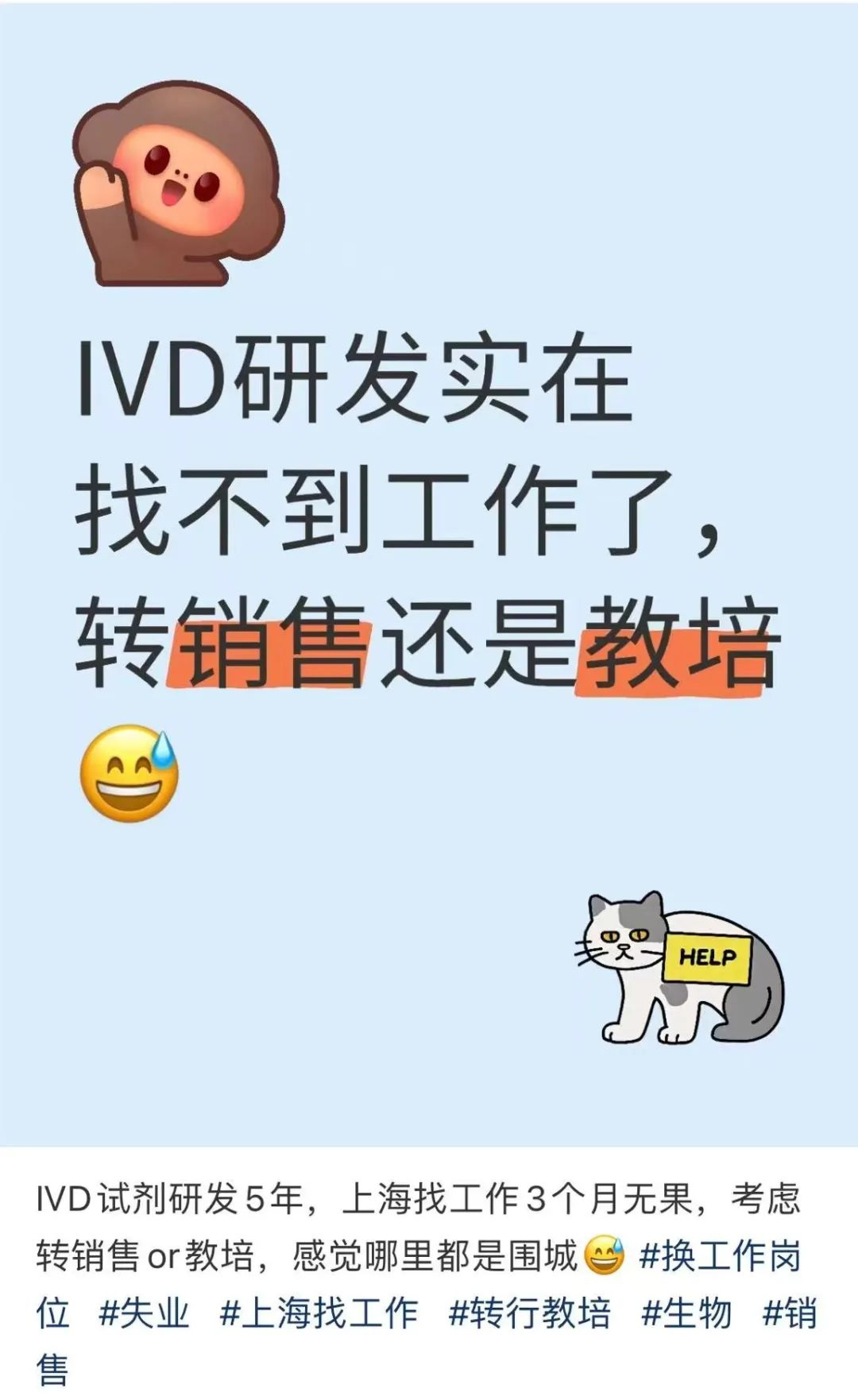 最近看小红书,发现很多IVD试剂研发的小伙伴失业,重新找工作也找不到,打算转岗销售或者教培。