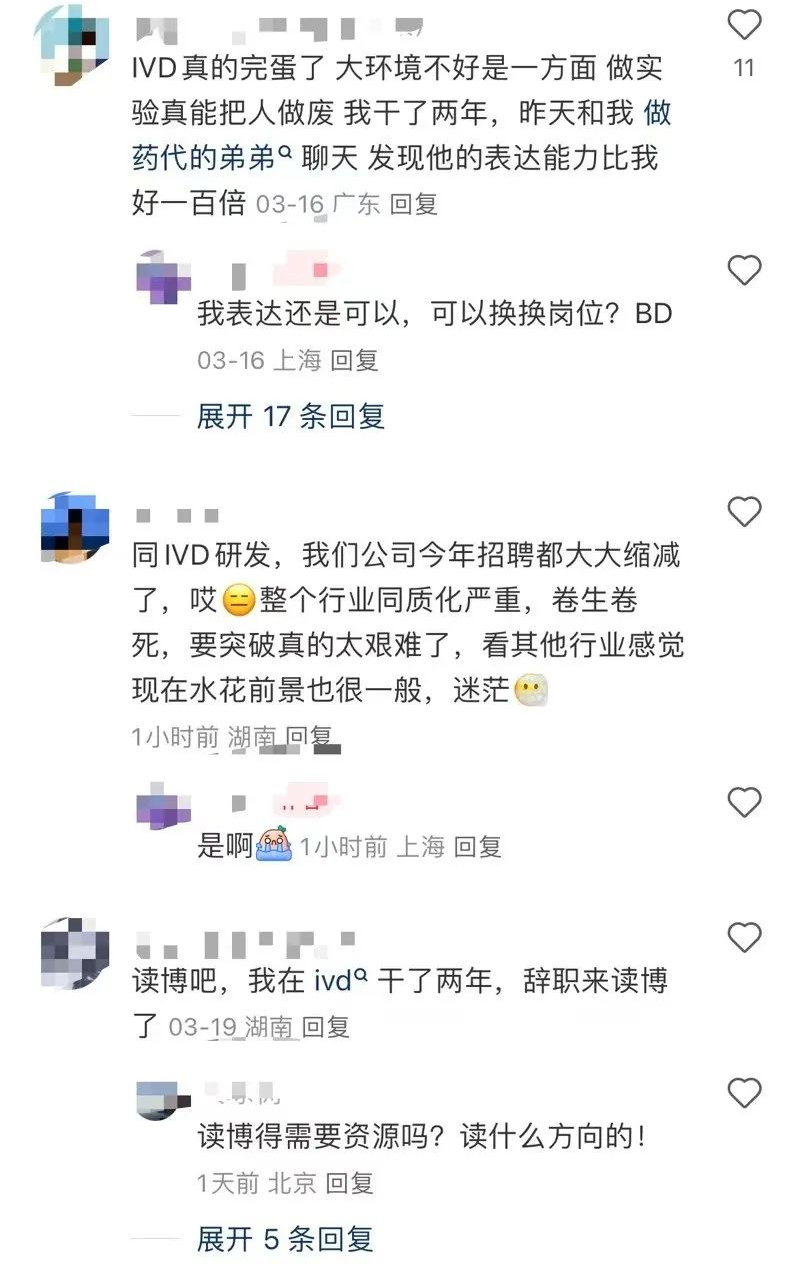 评论区里多名从业者提到IVD行业面临挑战,如招聘缩减、同质化严重、内卷加剧,导致行业突破艰难。有人指出实验工作枯燥(“做实验真能把人做废”),并对比药代(医药代表)的沟通能力,表达对自身职业发展的不满。