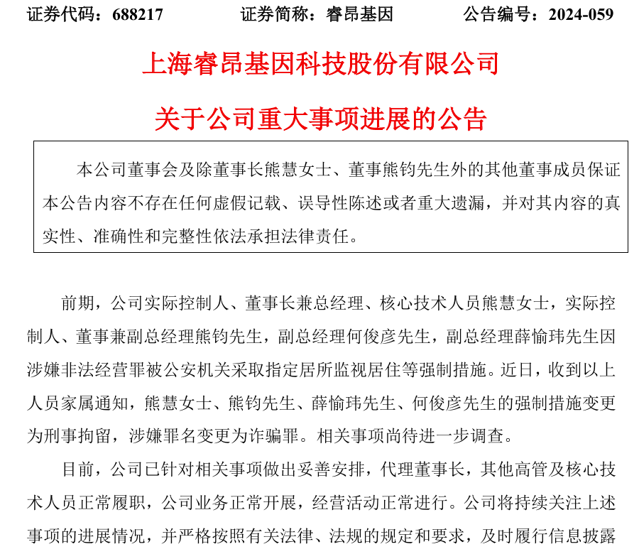 2024年7月22日,一则公告引发行业地震。睿昂基因宣布:4名核心高管突遭公安机关强制措施。