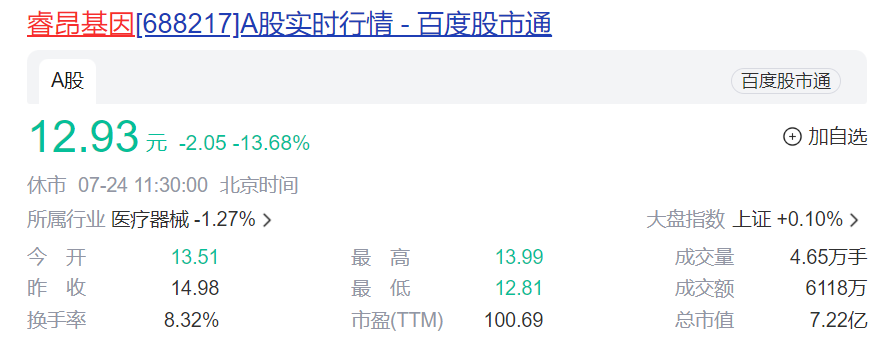 消息一出,资本市场为之震动。7月23日,睿昂基因股价20%跌停;次日再跌13.68%,两天内市值蒸发3.2亿元,总市值仅为7.22亿。