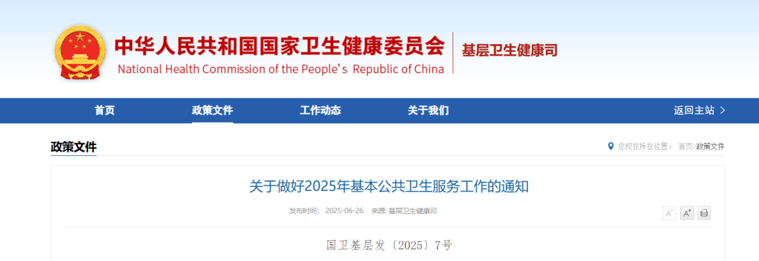 为深入贯彻党的二十届三中全会精神,落实新时代党的卫生与健康工作方针中以基层为重点、预防为主有关要求,持续提升基本公共卫生服务均等化水平,让群众可感可及,现就做好2025年基本公共卫生服务工作通知如下: