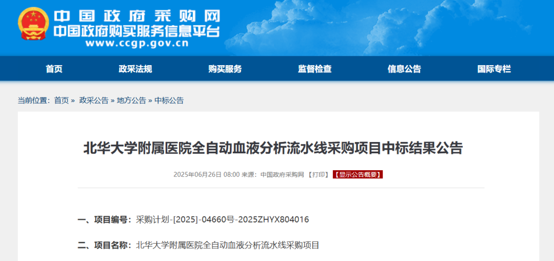 6月26日,中国政府采购网发布《北华大学附属医院全自动血液分析流水线采购项目中标结果公告》。中标公告显示,全自动血液分析流水线成交单价3980元,品牌为希森美康、普门。