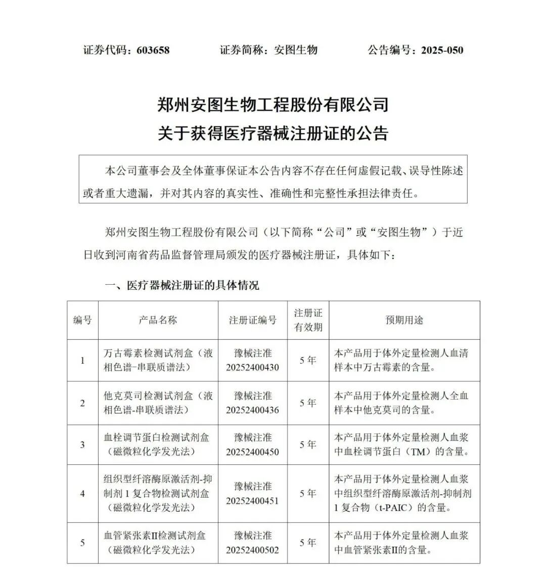 近期,安图生物万古霉素检测试剂盒(液相色谱-串联质谱法)、他克莫司检测试剂盒(液相色谱-串联质谱法)、血栓调节蛋白检测试剂盒(磁微粒化学发光法)、组织型纤溶酶原激活剂-抑制剂1复合物检测试剂盒(磁微粒化学发光法)、血管紧张素Ⅱ检测试剂盒(磁微粒化学发光法)等5项产品,获河南省药品监督管理局颁发的医疗器械注册证。新产品注册证的取得,进一步丰富公司产品线,不断满足市场需求。
