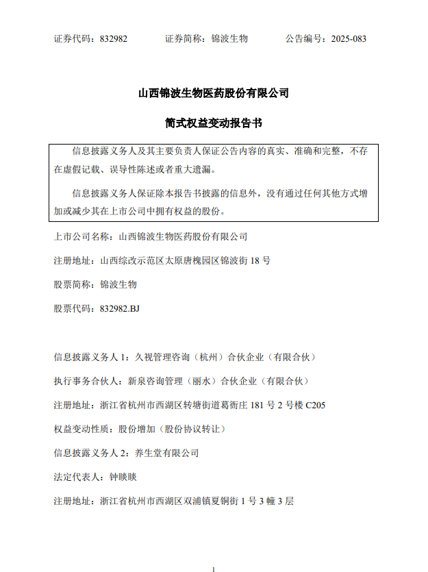 锦波生物公告显示,2025年6月26 日,公司控股股东、实际控制人杨霞与杭州久视签署了《股份转让协议》,杨霞将其持有的上市公司5,753,267 股无限售条件流通股(占签署日上市公司股本总额的 5%)连同与之相关的全部权利义务协议转让给杭州久视,转让价格为 243.84 元/股(含税),共计140,287.66 万元;