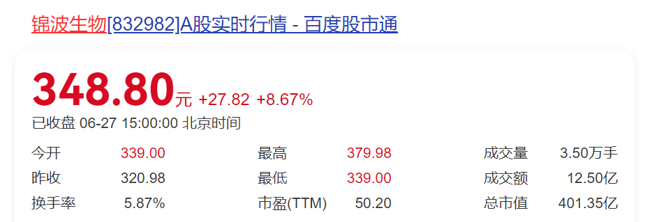 2023年7月20日,锦波生物(股票代码:832982)在北京证券交易所上市,成为北交所“重组胶原蛋白第一股”。目前市值超400亿元。