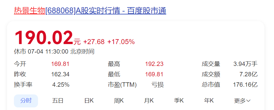 7月4日,热景生物股价继续大涨。截至发稿,热景生物上涨17%,上午收盘价为190元,总市值176亿元,创历史新高!