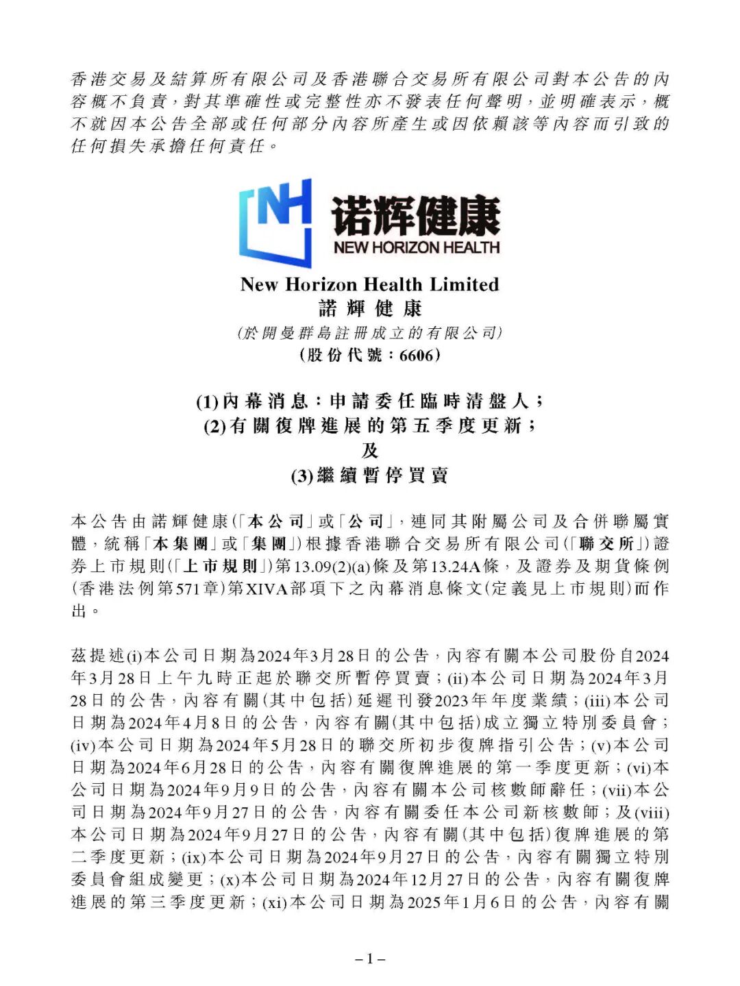 诺辉健康于2025年7月3日向开曼群岛大法院提交了有关委任共同临时清盘人的申请及清盘呈请。本公司目前正在等待大法院指派法官审理此案,随后方向大法院立案共同临时清盘人申请及呈请。本公司相信,提出共同临时清盘人申请符合公司股东及债权人之最佳利益。公司将于共同临时清盘人申请及呈请立案后,适时作出进一步公告。