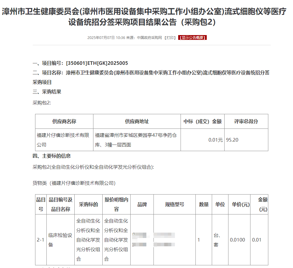 中标结果显示,以上产品均以0.01元中标。