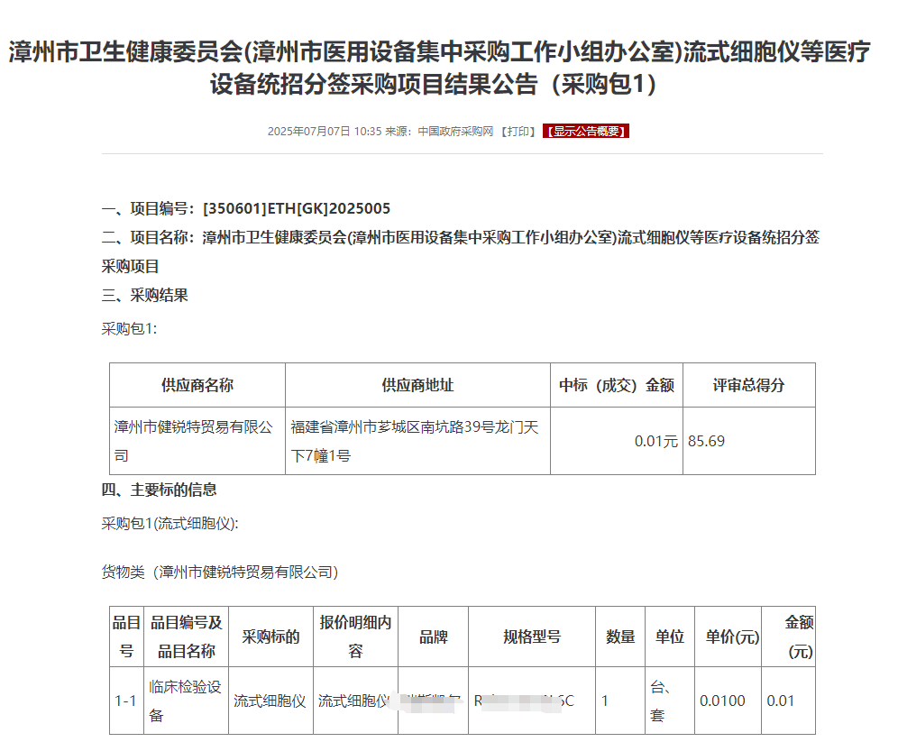 7月7日,中国政府采购网发布漳州市卫生健康委员会(漳州市医用设备集中采购工作小组办公室)流式细胞仪等医疗设备统招分签采购项目结果公告。其中包含对流式细胞仪和全自动生化分析仪和全自动化学发光分析仪组合。