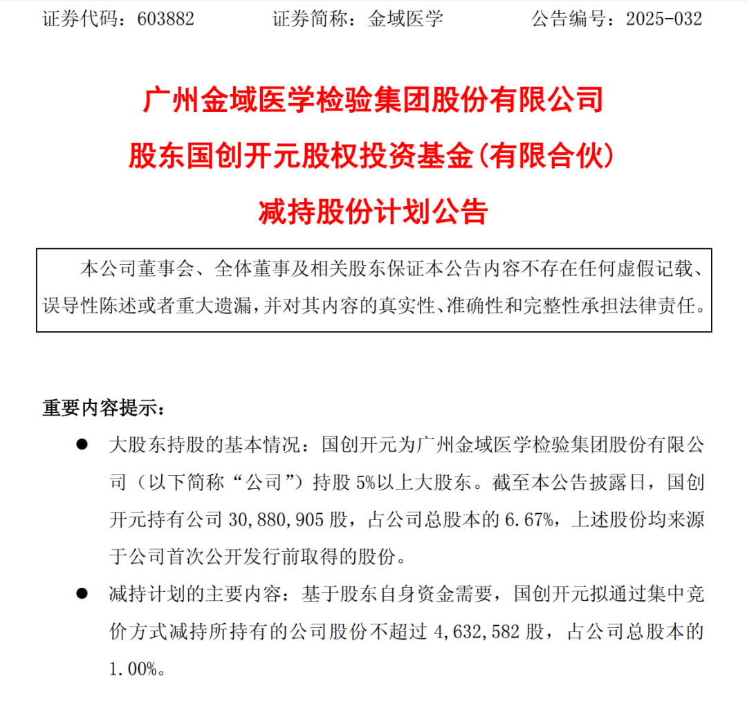 国创开元作为金域医学2017年IPO前的早期投资者,持股长达8年。此次减持1%后,其持股比例将降至5.67%,仍为重要股东。