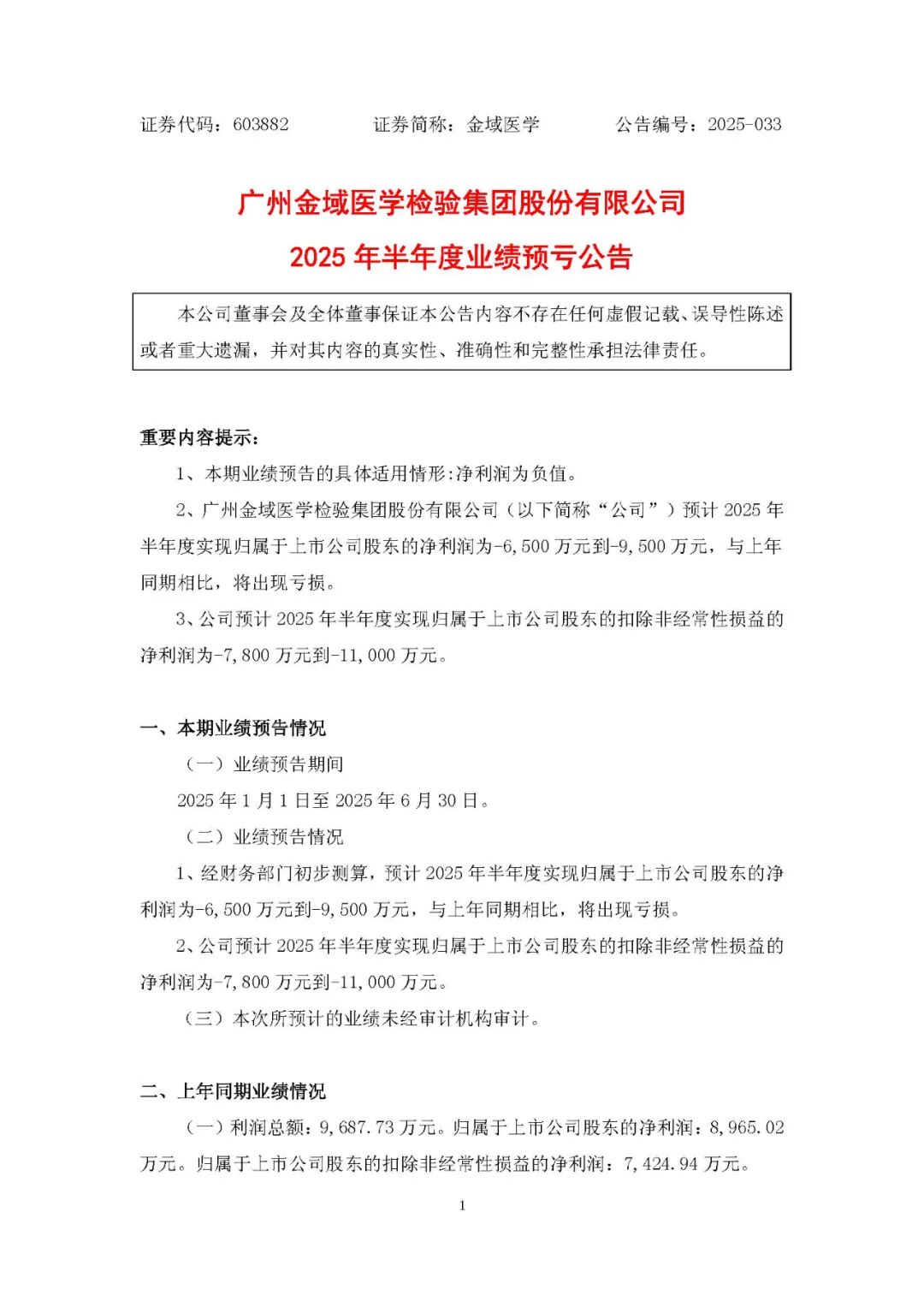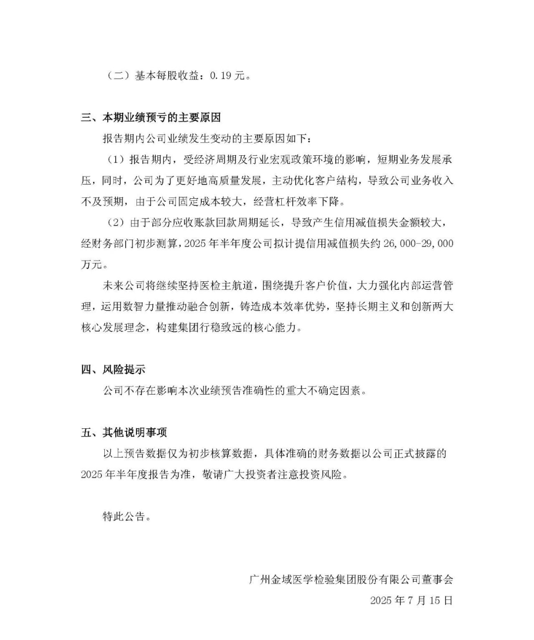 7月15日,金域医学发布2025年半年度业绩预亏公告。
