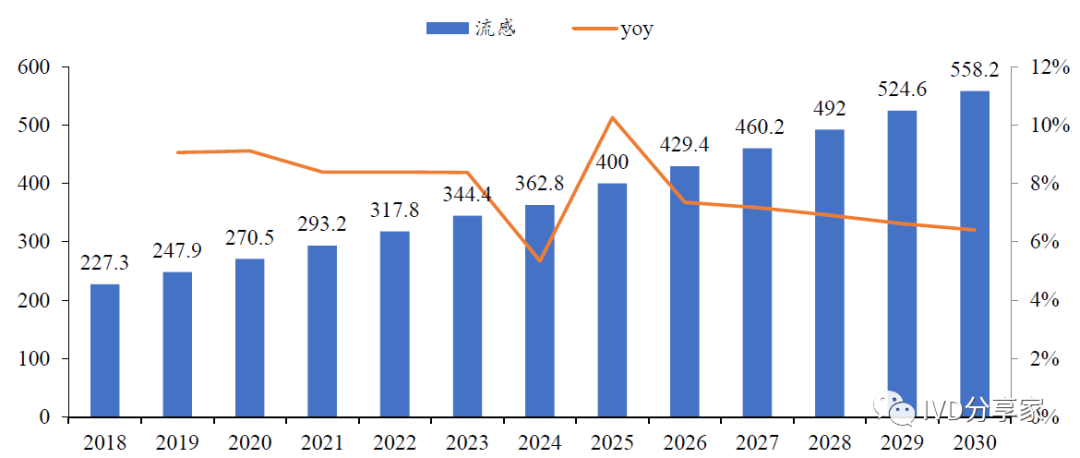 流感检测需求端持续向好。根据Kalorama Information 预测,我国流感IVD 产品需求在2023 年市场规模达3.44 亿美元,2018-2023 年复合增速8.7%,并有望在2025 年突破4 亿美元。根据万孚生物数据,该公司传染病检测产品(新冠时期前)销售收入由2015 年的1.51 亿元,增长至2019 年的5.79 亿元,复合年增长率为40%。