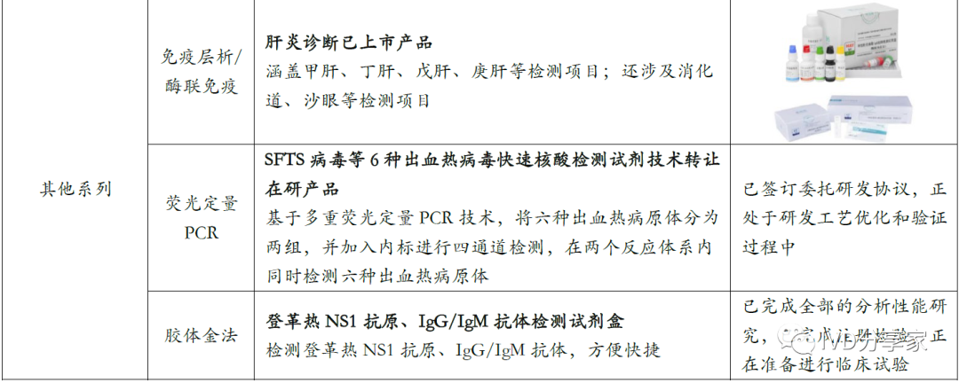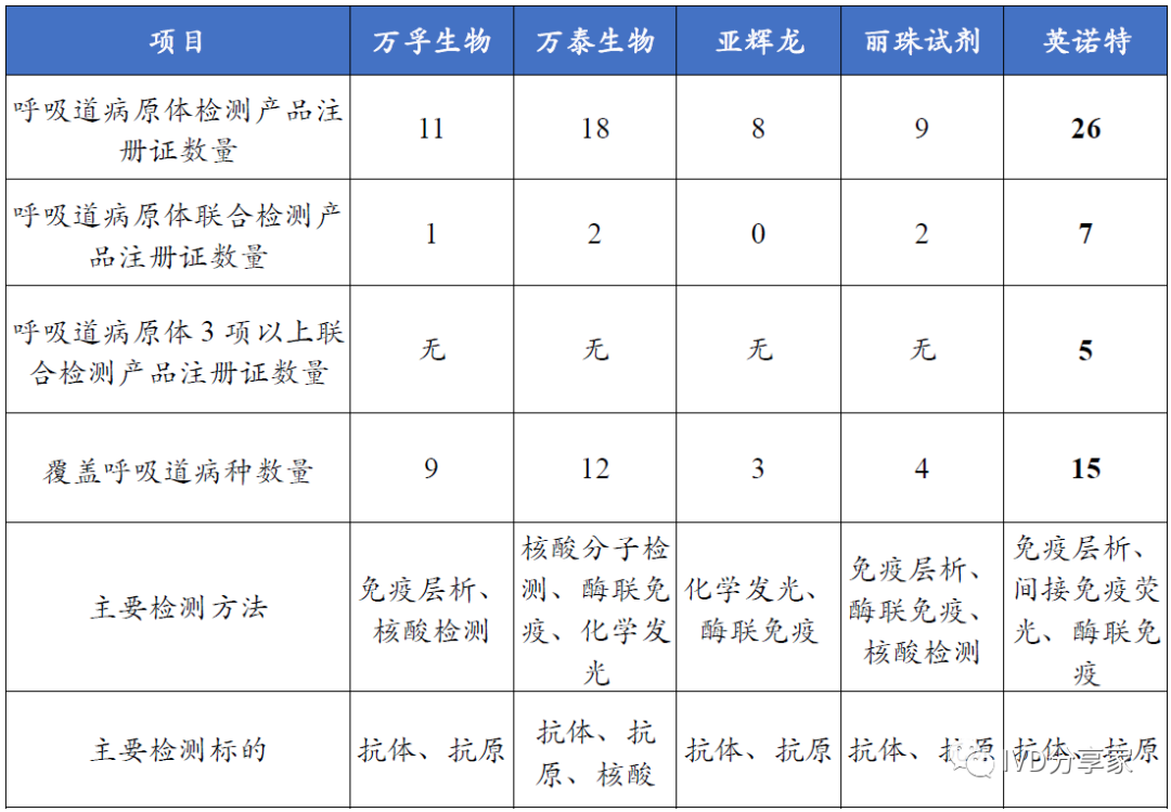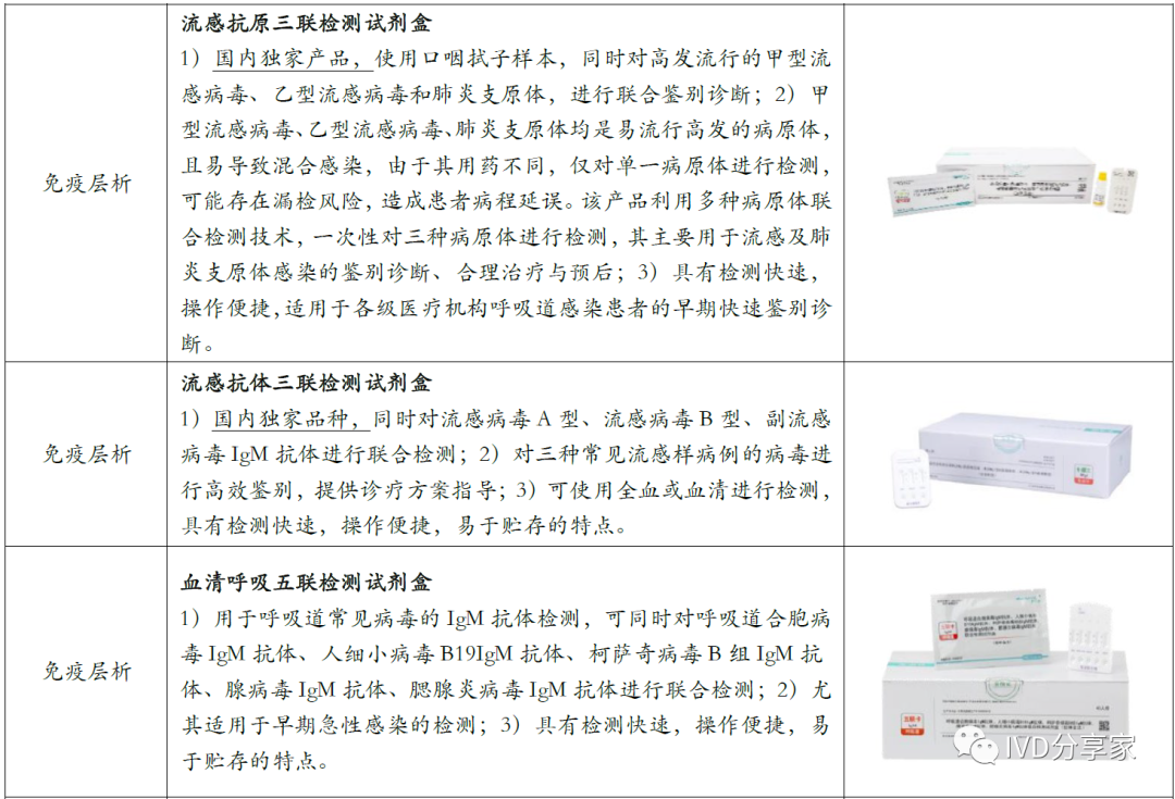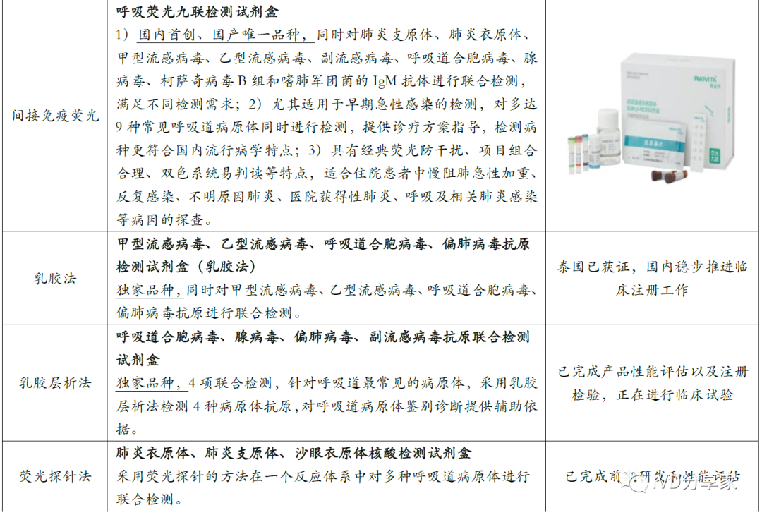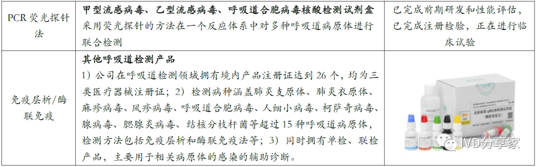 公司呼吸道检测产品已覆盖肺炎支原体、肺炎衣原体、呼吸道合胞病毒、腺病毒、柯萨奇病毒、人细小病毒B19、嗜肺军团菌、副流感病毒以及流感病毒(甲型流感病毒、乙型流感病毒)等多种常见病原体,其中多款产品为国内独家品种,以多项目联检为特色,具备较强的行业竞争力。