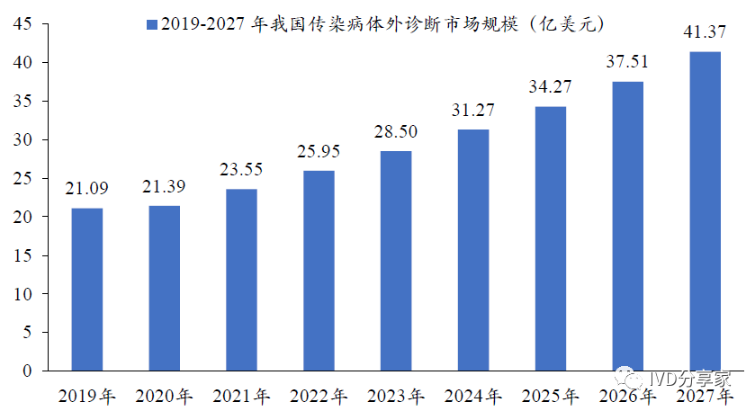 从市场规模来看,未来随着国家对传染病控制力度的不断加大,我国传染病体外诊断市场规模有望从2019 年的21.09 亿美元增至2027 年的41.37 亿美元,年均复合增长率为8.79%。