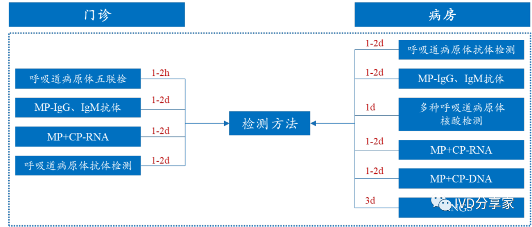 联检产品有效提升公立医院诊疗效率。以某儿童医院针对肺炎支原体(MP)的诊断方法为例,门诊和病房的诊断方法主要包括含MP 的多联检(三联检、五联检)、MP-IgG/IgM 抗体检测、MP+CP-RNA/DNA、NGS、核酸检测等;其中多联检是最快的肺炎支原体检测手段(1-2 小时出结果),能有效提高检出率的同时,降低复诊和等待周期,在多种呼吸道病原体流行高发时节加快公立医院门急诊诊疗效率。