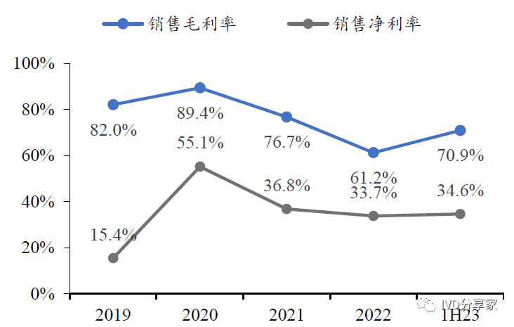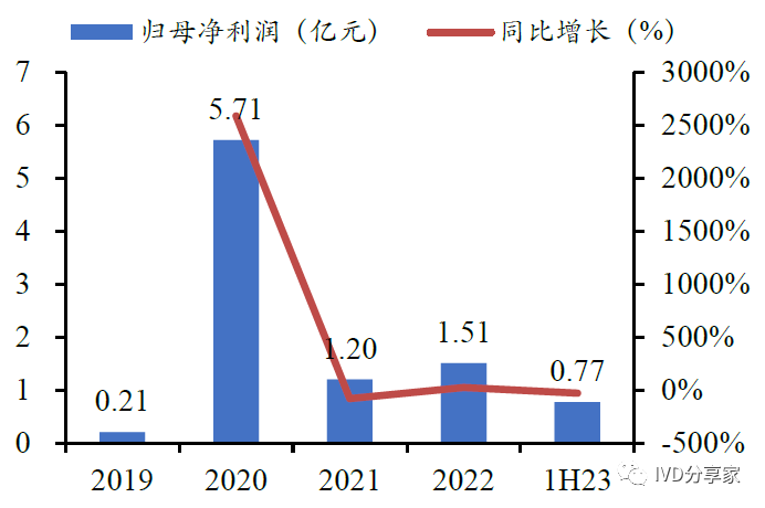 公司营业收入及净利润快速增长。公司营收由2019年的1.38亿元增长至2022年的4.47亿元,2019-2022年复合增长率为47.96%;归母净利润由2019 年的2100万元增长至2022 年的1.51 亿元,2019-2022 年复合增长率为93.01%。2020 年公司新冠产品(新冠抗原检测试剂)收入大幅增加,收入同比增幅651.46%;同时公司非新冠核心产品也受到疫情影响有所下滑。