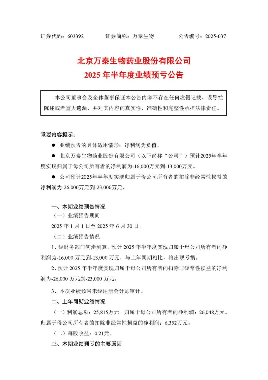 这是上市五年来头一回净利润亏损,业绩跳水严重。去年同期,万泰的利润约2.6亿元。