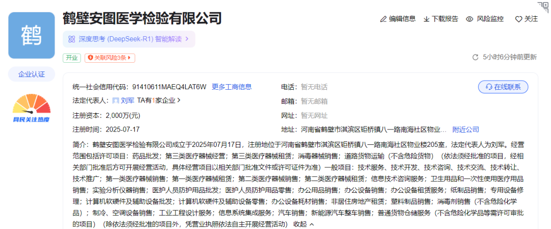 爱企查显示,近日,鹤壁安图医学检验有限公司成立,注册资本2000万元,经营范围包含:药品批发;第三类医疗器械经营;第三类医疗器械租赁;消毒器械销售;新能源汽车销售等。企查查股权穿透显示,该公司由安图生物间接全资持股。