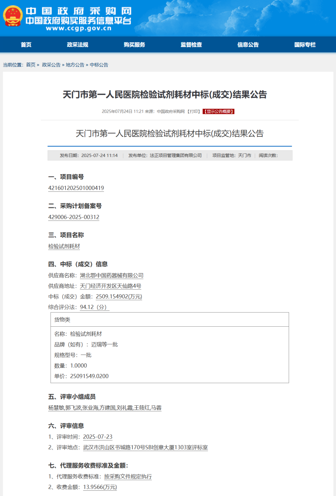 7月24日,天门市第一人民医院检验试剂耗材中标(成交)结果公告显示,迈瑞等一批检验试剂耗材中标,价格为2509.15万元,采购预算为2600万元。