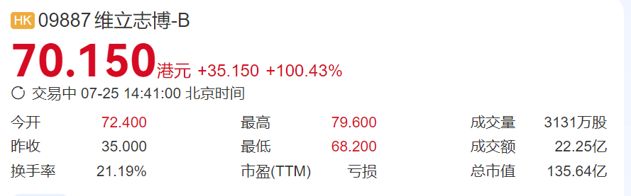 7月25日,南京维立志博生物在香港交易所主板鸣锣上市,股票代码:9887.HK,通过本次发行,维立志博预计募集资金总额可达1.89亿美元。开盘大涨100%,市值达到135亿。