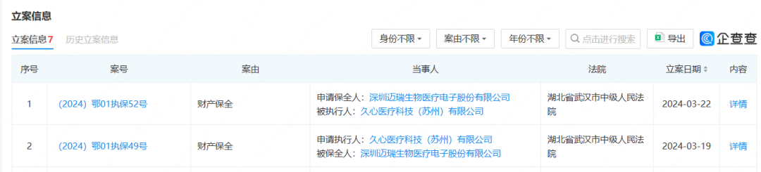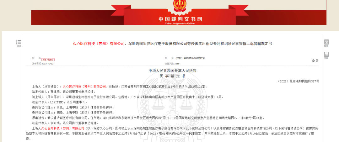 2020年2月18日,迈瑞公司经国家知识产权局授权取得涉案专利权,涉案专利权至今有效。迈瑞公司经调查发现,久心公司系半自动体外除颤器的制造商,其同时还通过投标、区域直销、经销商销售、线上销售等方式大范围销售、许诺销售被诉侵权产品。睿浩诚公司系久心公司的经销商,其在湖北地区销售被诉侵权产品。经比对,久心公司、睿浩诚公司制造、销售的被诉侵权产品的技术方案落入了涉案专利权的保护范围,侵害了迈瑞公司的涉案专利权。迈瑞随即提起诉讼,2022年3月17日立案受理。迈瑞公司起诉请求:1.久心公司、睿浩诚公司立即停止侵害迈瑞公司名称为“医疗设备”、专利号为20182227XXXX.X的实用新型专利(以下简称涉案专利)权的行为,即立即停止制造、销售或许诺销售侵害涉案专利权的产品,并立即销毁全部侵权产品、半成品以及相应的生产设备;2.久心公司向迈瑞公司支付损害赔偿金额500万元;3.久心公司、睿浩诚公司向迈瑞公司支付合理维权支出共计50万元;4.久心公司、睿浩诚公司承担本案的受理费、保全费等全部诉讼费用。随后,法院判决久心侵权成立。随后久心公司向最高法提出管辖异议,但最后也被驳回。在2024年、2025年,迈瑞和久心依然还存在司法纠纷的拉扯,有立案、有财产保全。从以上案件也说明,专利之争也是企业布局市场重要竞争力之一,但打官司很耗时耗钱耗费人力,你胜诉我不服,我再申请专利无效,极限拉扯之下,市场已经发生了新变化。和解可能是双方都退一步的好结果。从打官司的实力来说,迈瑞更胜一筹,近年来与多个同行都有法律纠纷,法务能力已经成为该企业重要的市场武器之一。久心医疗成立于2012年,是中国首家获得三类医疗器械AED注册证的民族企业。公司专注于提供具有完整自主知识产权的自动体外除颤器(AED)产品及配套院前急救解决方案,曾参与国家药监局《体外除颤产品注册技术指导原则》的编写工作。公司荣获国家高新技术企业、国家级专精特新“小巨人”企业等多项荣誉。