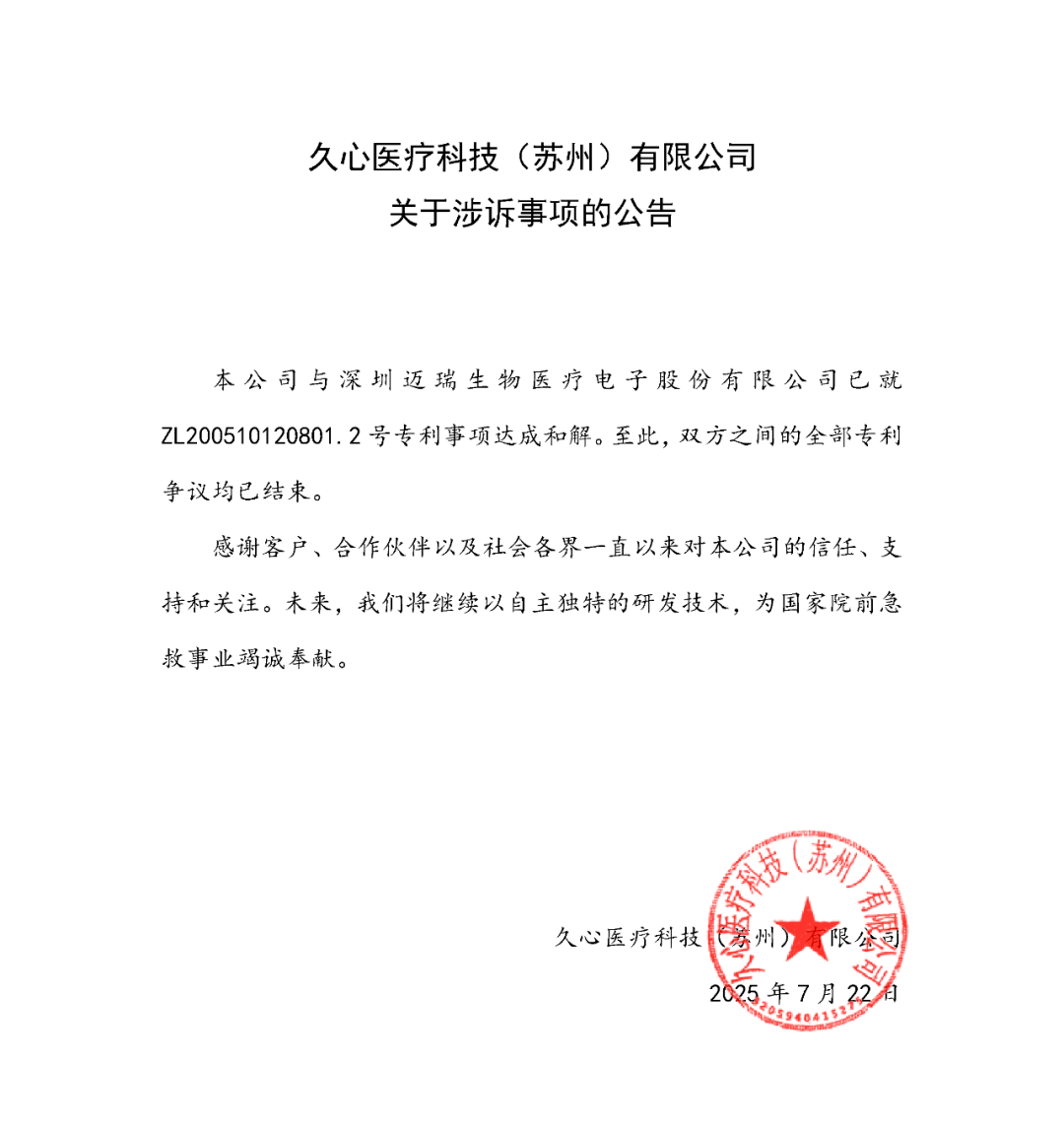 7月22日,久心医疗官微发布通告,宣布与迈瑞的专利权之争,双方已达成和解。