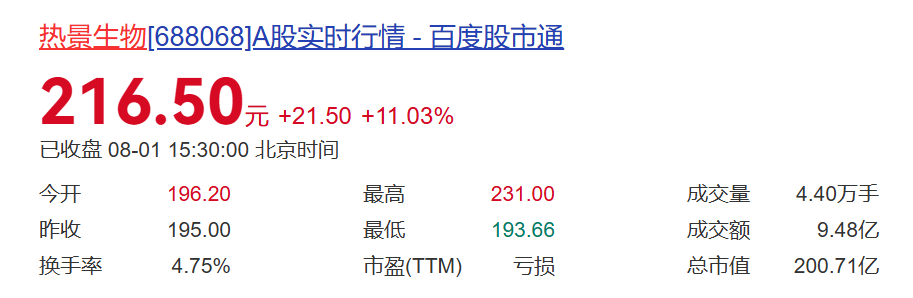 8月1日,热景生物股价继续大涨,股价为216.5元,总市值200.71亿元,创历史新高!