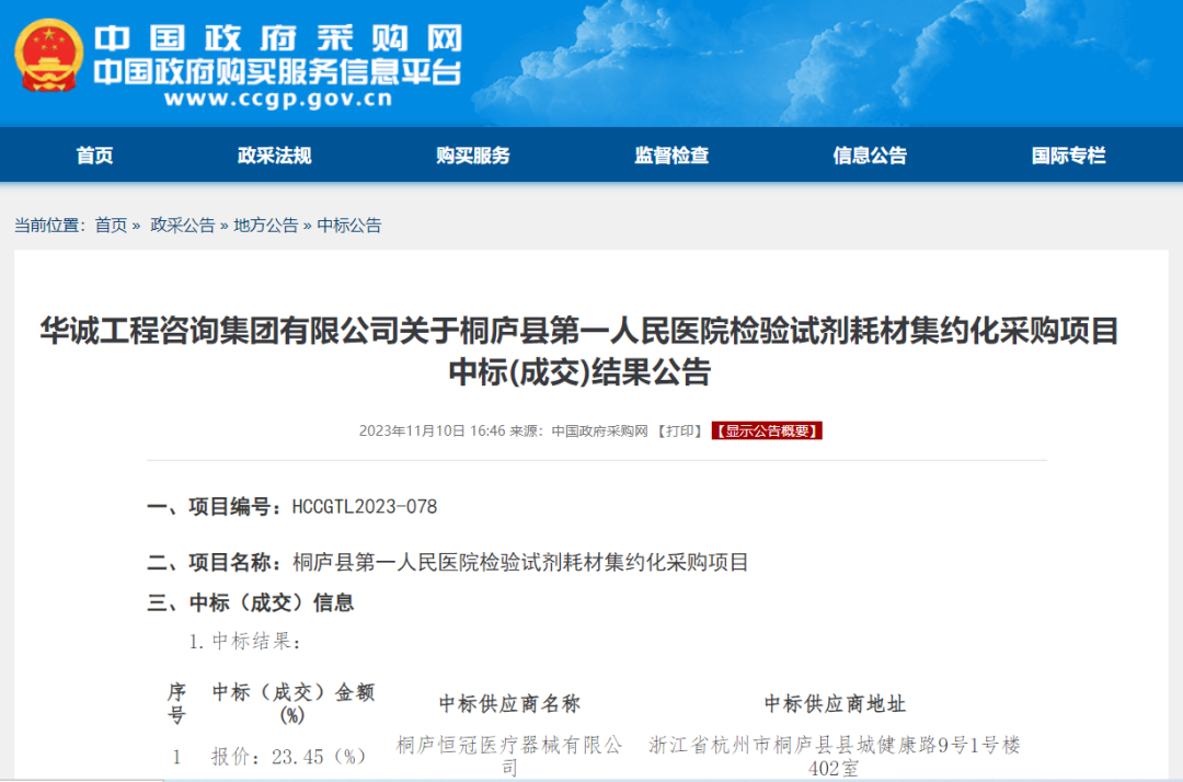 11月10日,中国政府采购网公布一则中标公告。桐庐县第一人民医院检验试剂耗材全部集约化配送。
