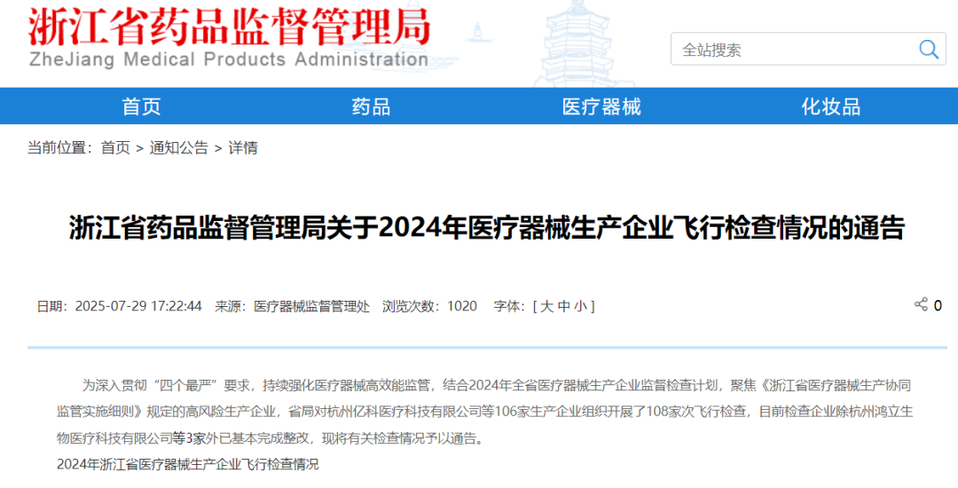 7月29日,浙江省药品监督管理局发布关于2024年医疗器械生产企业飞行检查情况的通告。