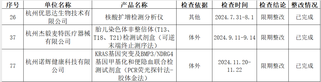 其中包括3家IVD企业,分别为杭州优思达生物技术有限公司、杭州杰毅麦特医疗器械有限公司、杭州诺辉健康科技有限公司。要求限期整改,目前已整改完毕。