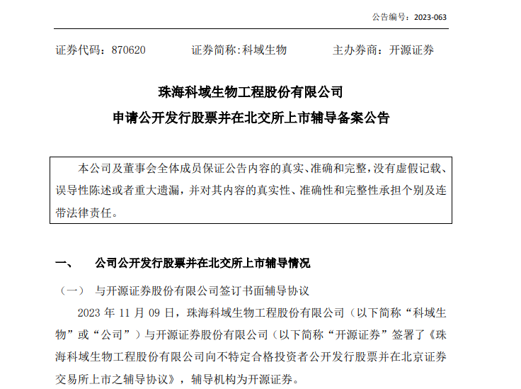 公告显示,11月9日,科域生物与开源证券股份有限公司签署了《珠海科域生物工程股份有限公司向不特定合格投资者公开发行股票并在北京证券交易所上市之辅导协议》,辅导机构为开源证券。