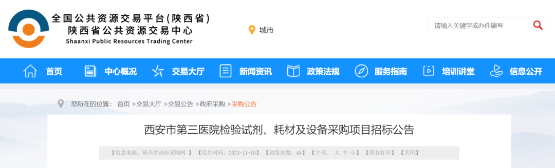 注意:已于11月16日发布“西安市第三医院检验试剂、耗材及设备采购项目采购更正公告(第一次)”,更正原因:招标文件变更。