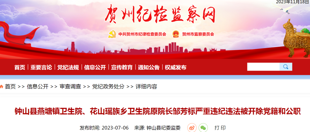 日前,钟山县纪委监委对钟山县燕塘镇卫生院、花山瑶族乡卫生院原院长邹芳标进行了纪律审查和监察调查。