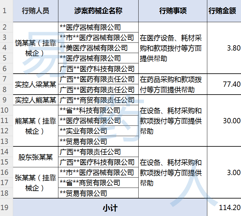 起诉书显示,2012年至2021年这九年间,邹芳标利用职务之便,在医疗设备、耗材及药品的采购和款项拨付等方面为4名供应商谋取利益,非法收受好处费共计114.2万元,涉及17家药械企业,详情统计如下: