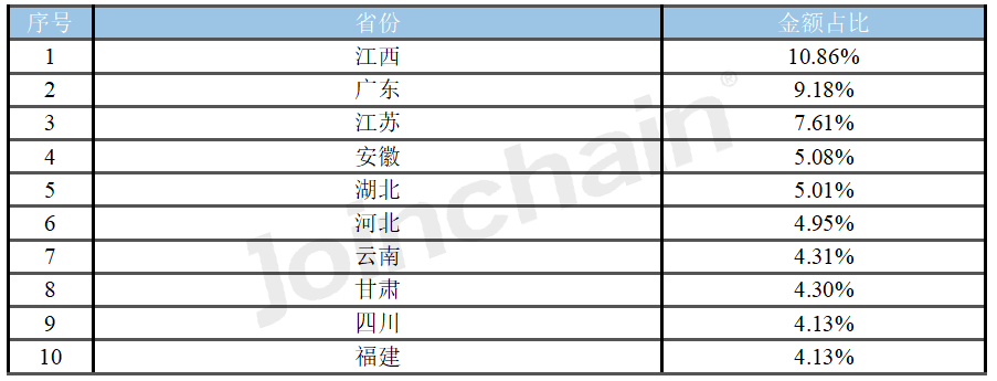 根据中标结果,2023年10月生化分析仪招标较活跃的地区主要在江西省,采购金额占比为10.86%,广东省排在第二,金额占比为9.18%,江苏省为第三位,金额占比为7.61%。