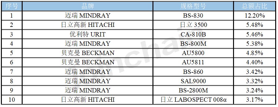 从型号上观察,2023年10月份,迈瑞型号为BS-830的生化分析仪排名第一,其中标总额占比为12.20%;位居第二的是日立高新的日立 3500,中标总额占比为5.48%;优利特排名第三,型号为CA-810B,中标总额占比为5.46%。