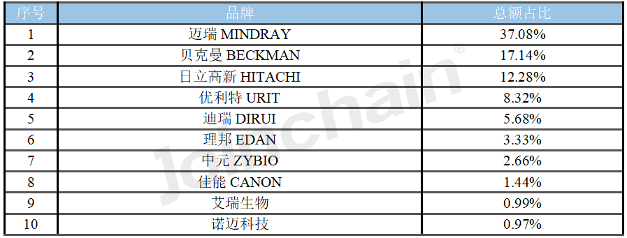 图表1 2023年10月生化分析仪品牌中标情况(Top10)