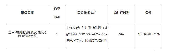 项目名称:北京医院国家公共实验室能力提升工作检验科全自动核酸提纯及实时荧光PCR分析系统采购项目注解:投标人必须对要求的所有货物和服务给予报价,不允许拆分投标。投标文件正、副本必须分开装订成册。1.满足《中华人民共和国政府采购法》第二十二条规定;2.1 供应商不能是被列入“信用中国”网站(www.creditchina.gov.cn)失信被执行人、重大税收违法案件当事人名单的供应商,不能是被列入“中国政府采购网”网站(www.ccgp.gov.cn)政府采购严重违法失信行为记录名单中仍被禁止参加政府采购活动的供应商。2.2 单位负责人为同一人或者存在直接控股、管理关系的不同供应商,不得参加同一包的投标或者未划分包的同一招标项目的投标。违反上述规定的相关投标均无效。北京医院始建于1905年,最初的名称叫德国医院,二战胜利后改称市立北平医院。现已经发展成为一所面向全社会开放,医疗、保健、教学、科研、预防全方位发展的现代化综合性医院。不仅是直属国家卫生健康委员会的三级甲等医院,而且也是国家主要的医疗保健基地。根据目前最新中国医院综合排名,北京医院入围前60强。