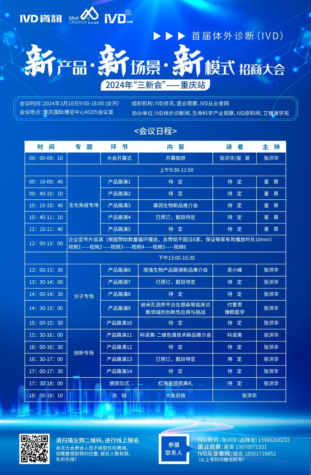 关于会议报名,这次我们主要是邀请各位IVD中小型代理商朋友们来参加我们的三新会,不收取任何的报名费用,但是需要大家提前报名,如果报名人数超过400人,我们将会采取限流措施,鼓励大家在线观看(IVD从业者网,IVD资讯、医业观察三大视频号会同步直播)。