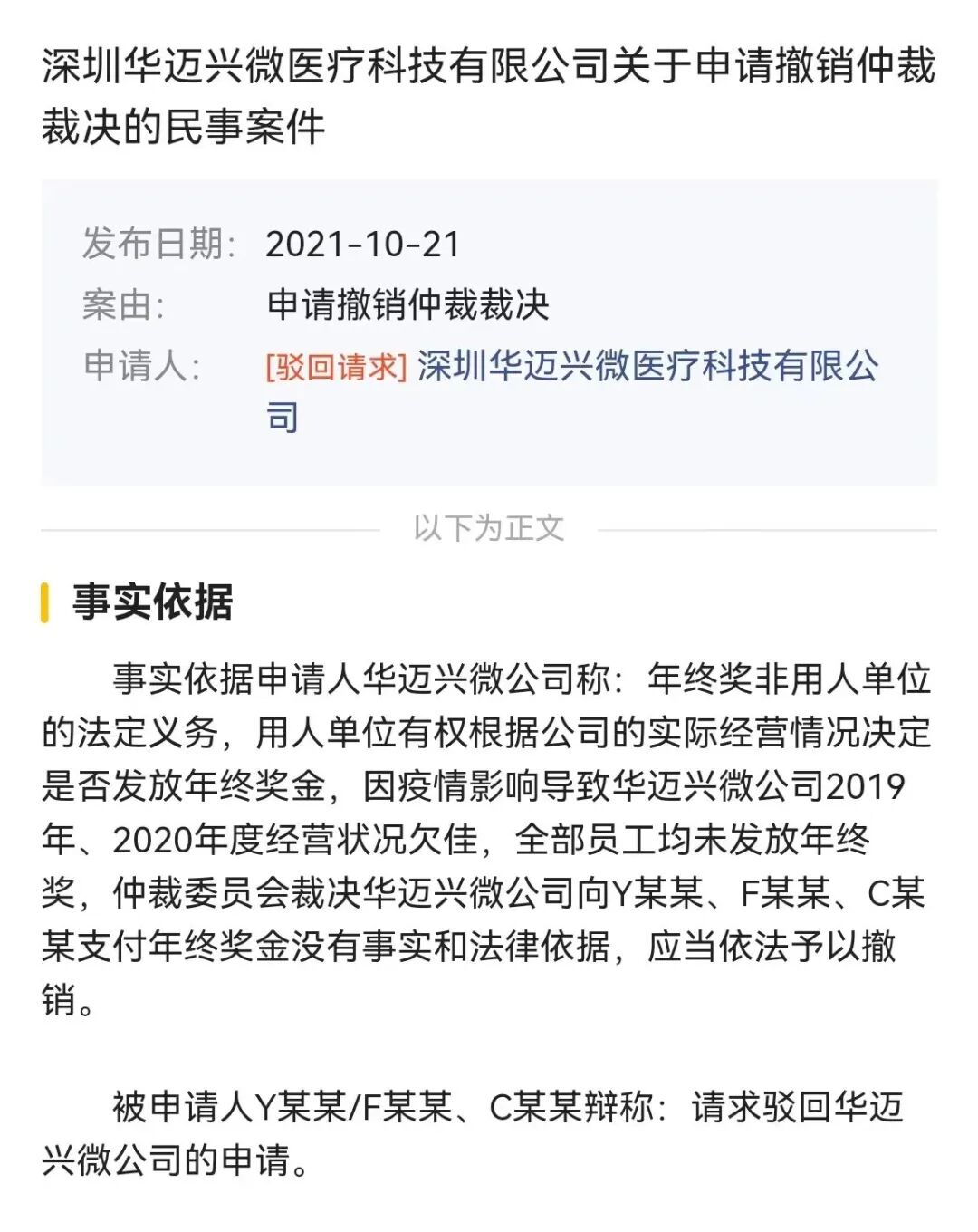 该仲裁显示,华迈兴微因为“2019年、2020年度经营状况欠佳”,拒绝向员工支付年终奖,引发员工的仲裁。