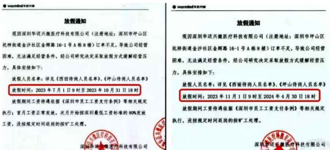 根据网络流传的《放假通知》,深圳华迈兴微医疗科技有限公司给部分员工从2023年7月1日开始放假,一直到2024年4月底,时间跨度长达10个月。