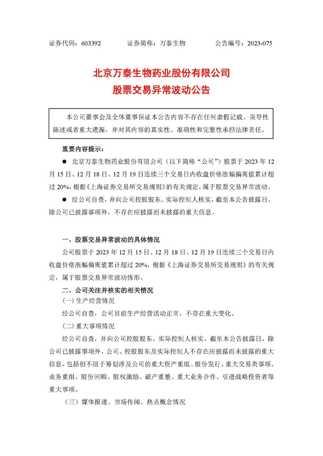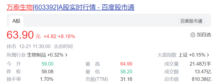 万泰生物12月21日再度涨停,5个交易日内录得3个涨停,累计涨幅为36.13%。