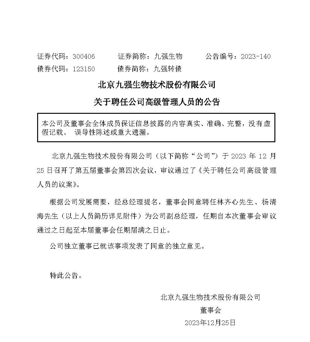 12月25日,九强生物公告,董事会于近日收到