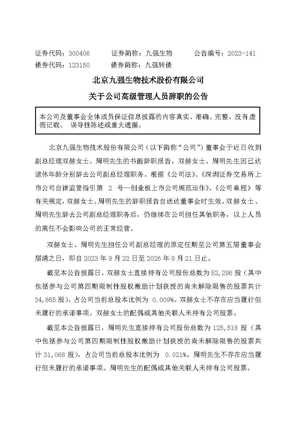 双赫女士、 周明先生辞去公司副总经理职务后,仍继续在公司担任其他职务,以上人员的离任不会影响公司的正常经营。双赫女士、周明先生担任公司副总经理的原定任期至公司第五届董事会届满之日,即自2023 年 9 月 22 日至 2026 年 9 月 21 日止。