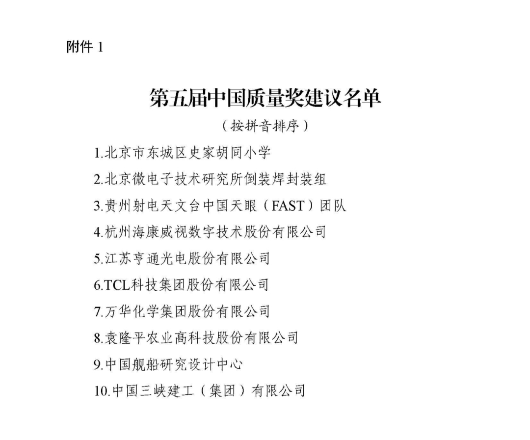按照《中国质量奖管理办法》规定,经第五届中国质量奖评选表彰委员会投票表决,10家组织进入第五届中国质量奖建议名单,78家组织、6名个人进入第五届中国质量奖提名奖建议名单,现将名单予以公示。