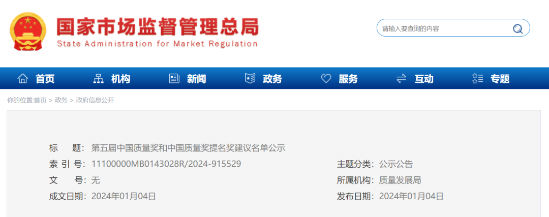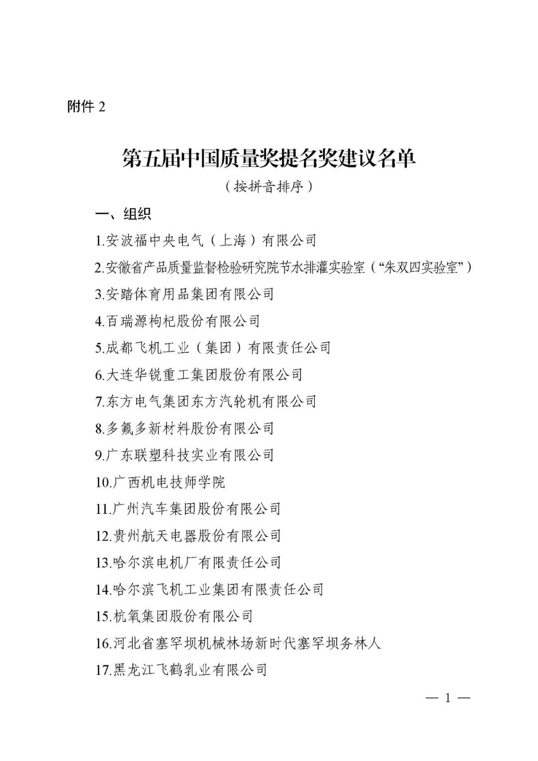 第五届中国质量奖和中国质量奖提名奖建议名单公示