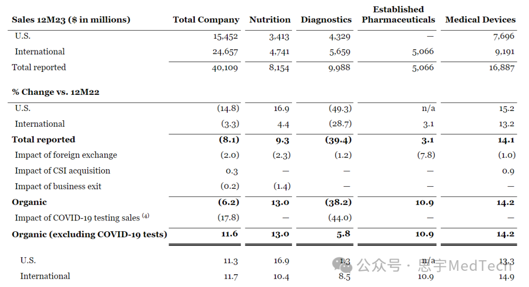 2023财年,雅培全年营收401.1亿美元,同比下降8.1%。除了诊断业务同比猛烈下跌39.4%外(99.88亿美元),营养品(81.54亿美元,增长9.3%)、药品(506.6亿美元,增长3.1%)、医疗器械业务(168.9亿美元,增长14%)都实现了正增长,(营养品和药品季度性疲软)。按地区划分,美国地区全年营收76.96亿美元,美国以外的地区营收91.91亿美元,这说明雅培很在意美国以外的市场。按业务部门划分,雅培医疗器械业务全部实现正增长。