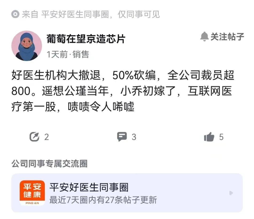 此前,有网友在脉脉平台曝料称,“好医生机构大撤退,50%砍编,全公司裁员超800。”“平安旗下子公司裁员40%,技术、业务、职能无一幸免……”