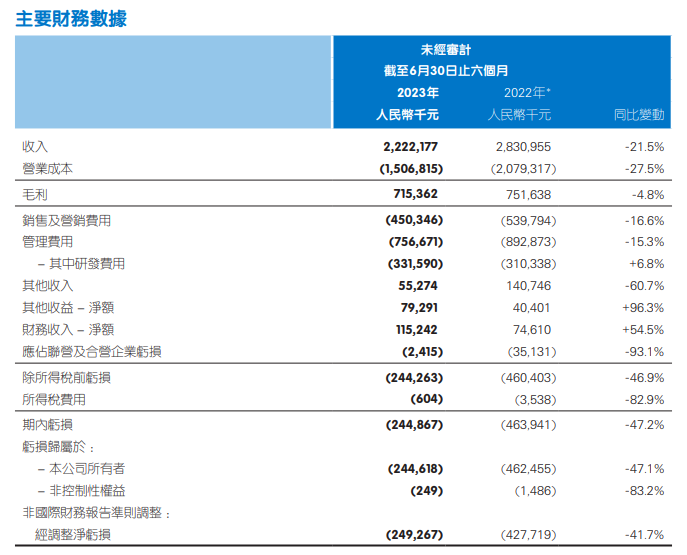2023上半年则是在2022年的基础上再降了21.5%。公司表示:收入下降归因于对低战略协同业务的调整完成,对整体收入产生影响。不过尽管收入下降,公司在净亏损方面有所好转,减少了47.2%。