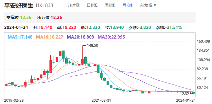 随后开始逐步下滑,2024年1月23日一度触底12.56港元,创上市以来新低。截止1月24日收盘,其股价为13.94港元/股,总市值为155.96亿港元。三年内市值蒸发超1400亿港元。